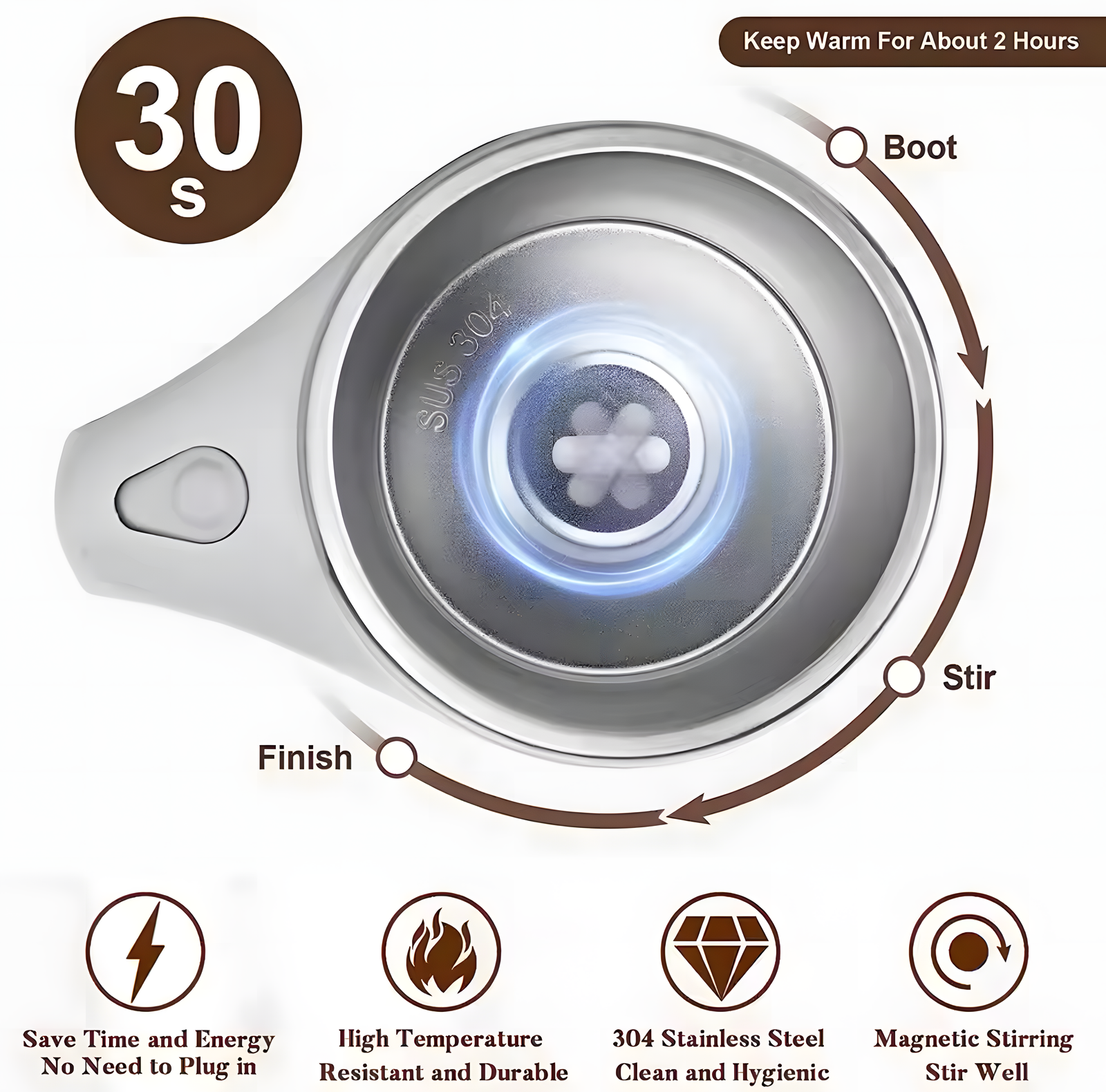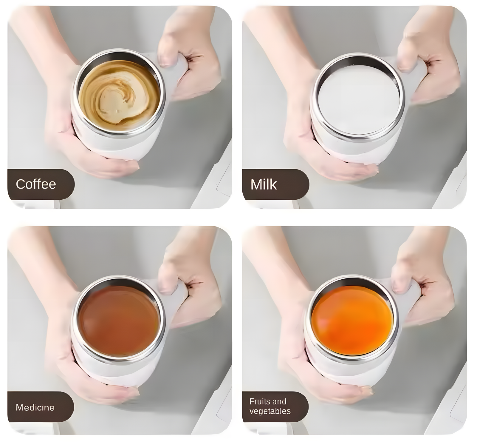– Simplemente presione el interruptor para enfriar rápidamente y agitar la bebida. Puede agitar y enfriar café, leche, jugo, medicamentos, proteína en polvo, etc.